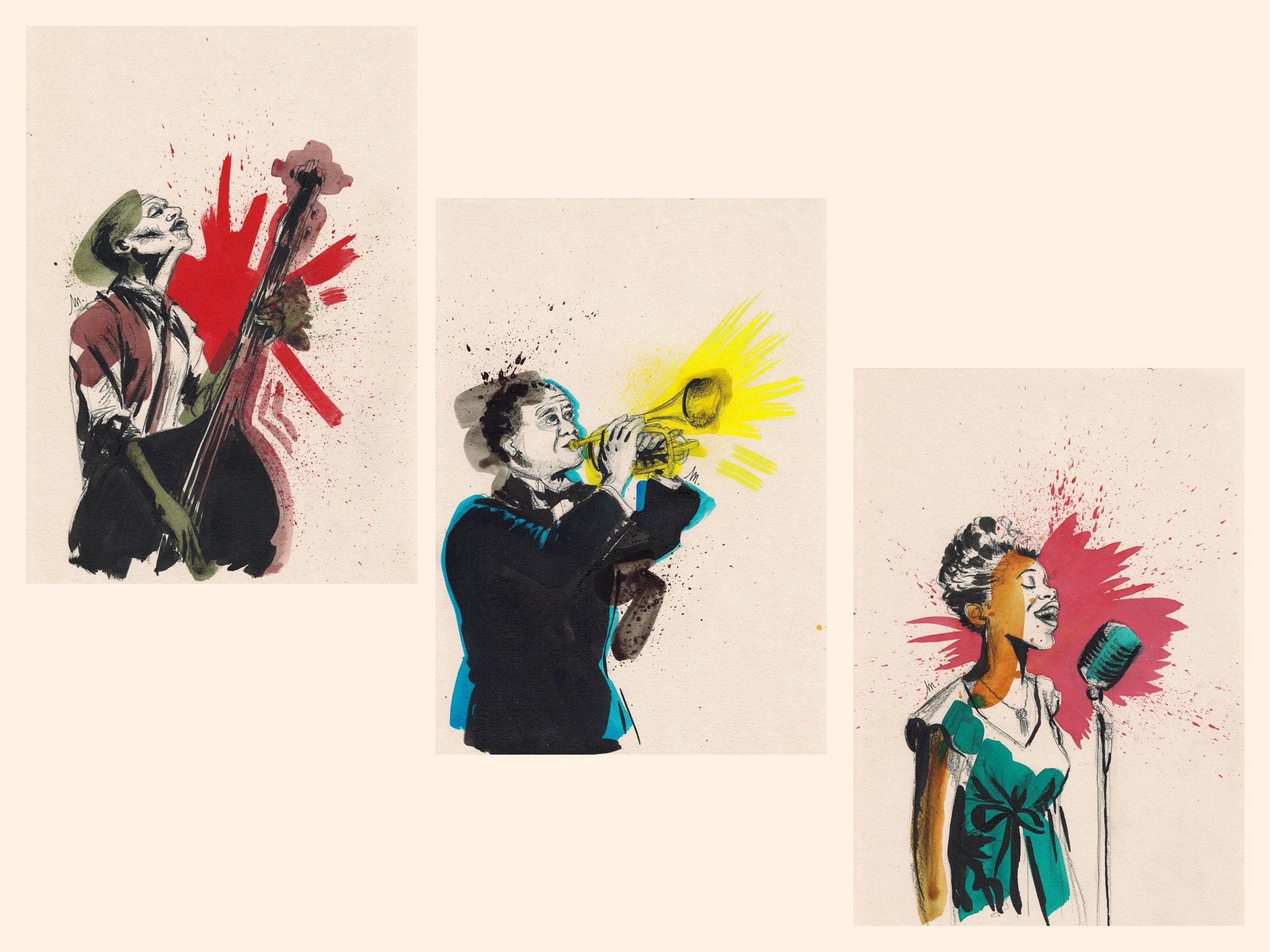 Jazz, série de trois illustrations (trompettiste, chanteuse, contrebassiste)